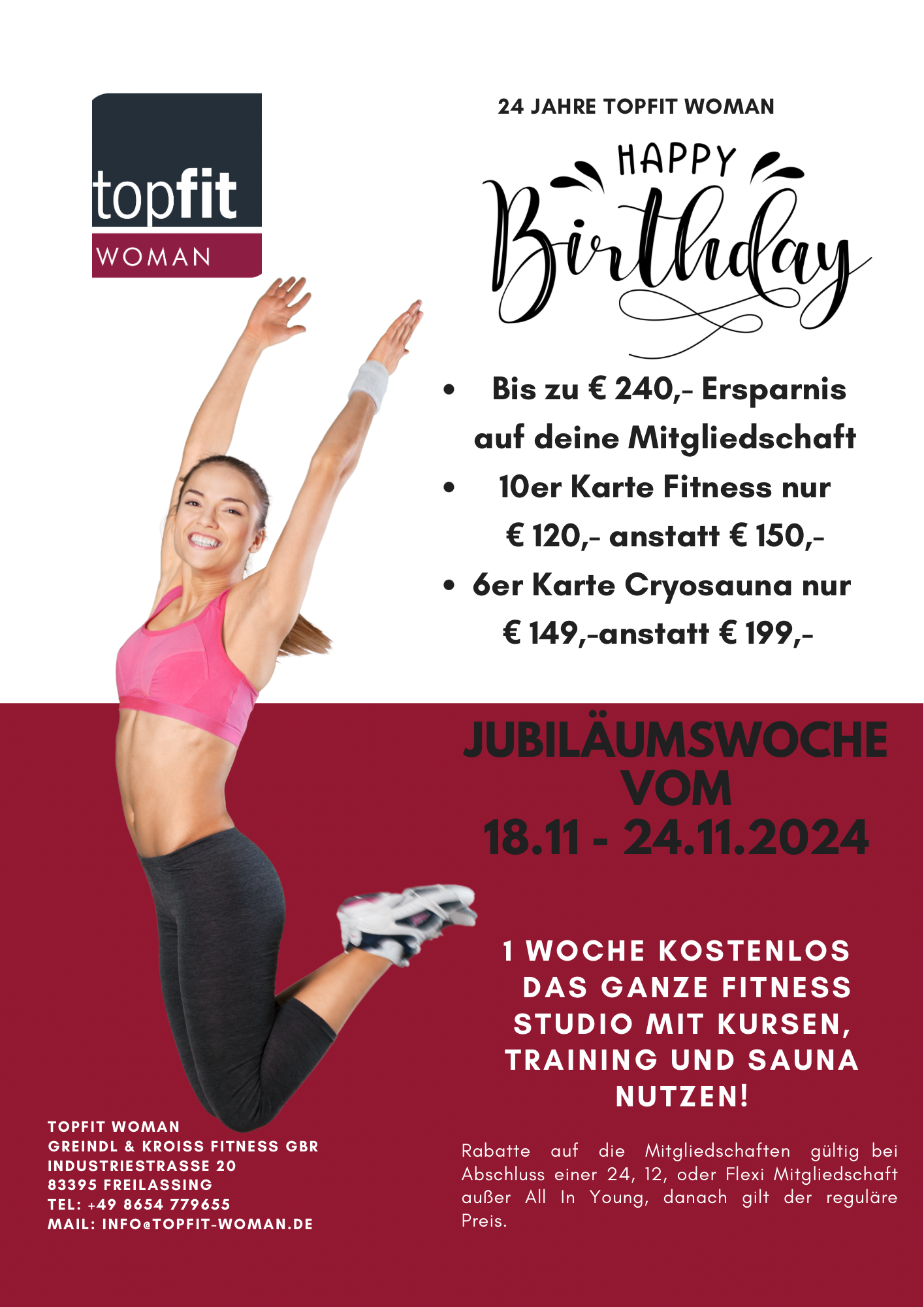 Zum Anlass unseres 24. Geburtstags feiern wir eine ganze Woche mit speziellen Aktionen für euch. Eine ganze Woche voller Specials, Kursen, Aktionen und vergünstigten Schnäppchen, dass der Black Friday neidisch wird ;-)) Vor allem am 19.11.2024, dem Tag an dem wir genau 24 Jahre werden, wird gefeiert. Dazu bieten wir euch zum einen weiterhin euer gewohntes Kursprogramm an, des weiteren gibt es spezielle Kneippaufgüsse und natürlich darf der Prosecco zum Anstoßen und Feiern nicht fehlen. Die weiteren Aktionen im Überblick zur Geburtstagswoche…… …. Vergünstigte Verträge , bei denen ihr bis zu € 240,- spart auf den 24 Monatsvertrag ….. € 120,- auf die 12 Monate und All In Young, sowie € 60,- auf die All In Girl Mitgliedschaft …… Flexi Card anstatt € 69,- nur € 59,- pro Monat ….. 20 % geschenkt auf das Bistroguthaben , d.h. bei € 50,- Einzahlung bekommt ihr € 10,- geschenkt. Einzahlungen ab € 25,- möglich ….. Fitness 10er Karten nur € 120,- anstatt € 150,- In diesem Preis ist Fitness, Kurse, Sauna, Kraft- und Ausdauertraining, sowie Getränke inklusive Schaut in dieser Woche vorbei, nehmt eure Freundin, Tochter, Mama oder #besties mit, denn die ganze Woche könnt ihr kostenlos schnuppern. Wir freuen uns auf EUCH!